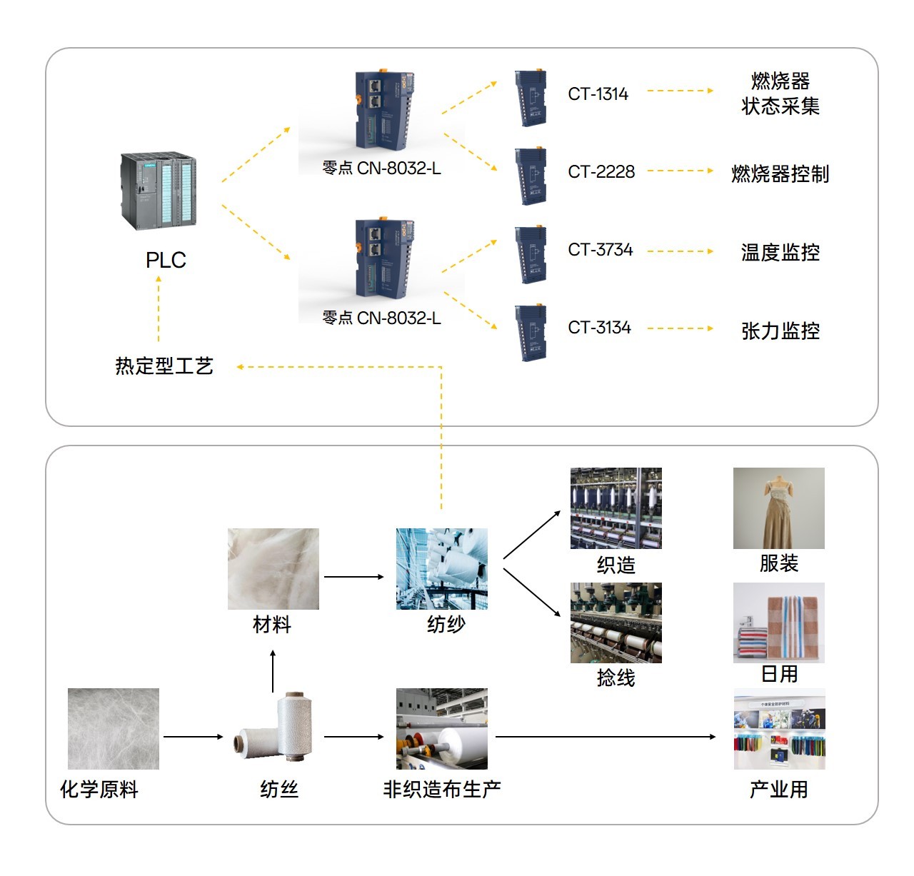 其中清梳机,喷水织机,环锭纺机,定型机,码垛机等自动化机械手设备涉及到大量的自控需求,目前业内采用施耐德,西门子等进口品牌居多,随着国产品牌的崛起,带来了更稳定的产品和更低的价格,越来越多的企业采用零点的分布式IO模块来替换原来的进口品牌,实现降本增效